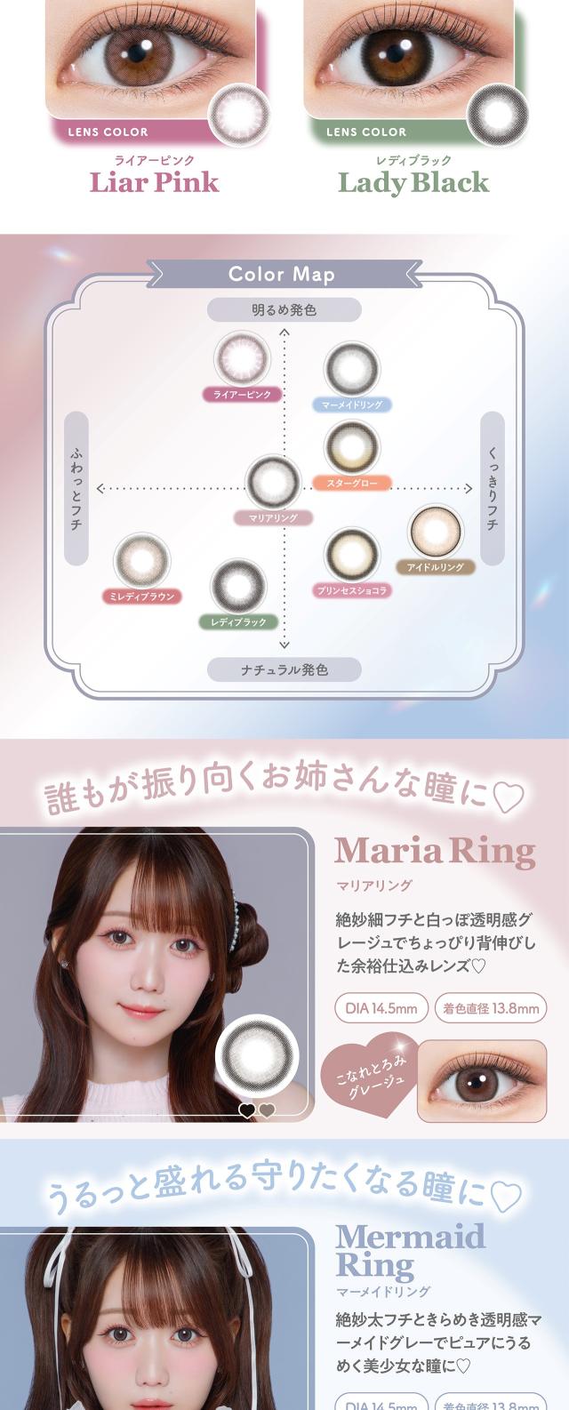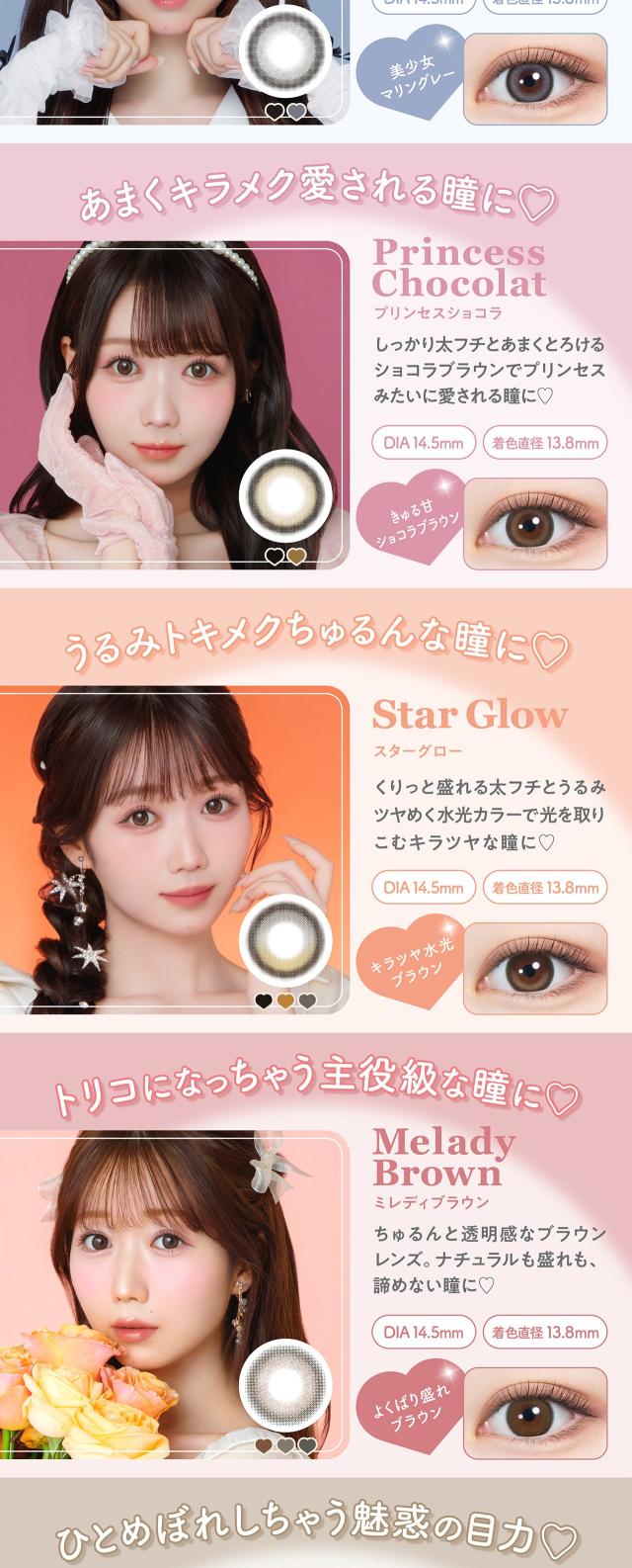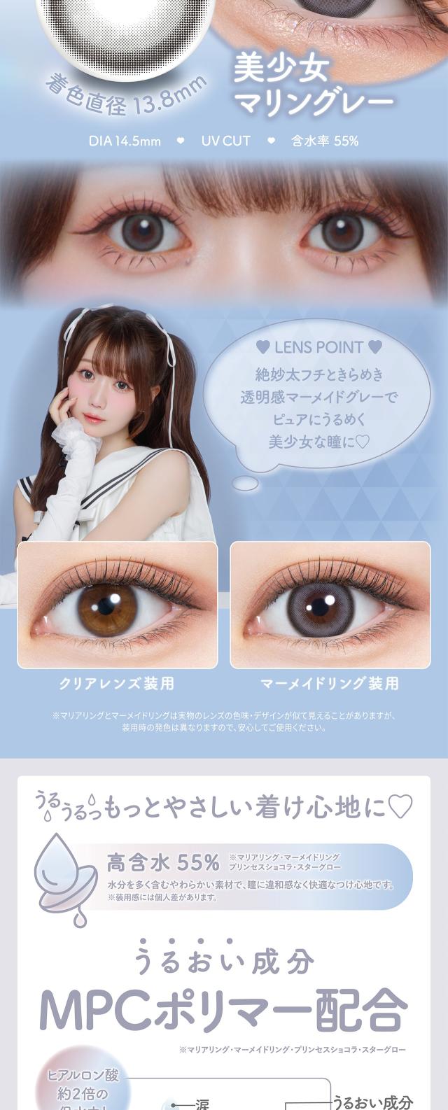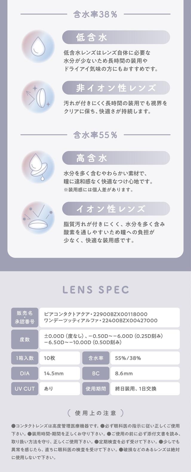 ■商品名: mimuco 1day ■枚 数: 1箱 / 10枚入 ■使用期限: 1日使い捨て ■度数(POWER):度なし(±0.00) -0.50〜-6.00(-0.25ステップ) -6.50〜-10.00(-0.50ステップ) ■直径(DIA): 14.5mm ■ベースカーブ(BC): 8.6mm ■含水率: 38% / 55% ■種 別: カラコン,カラーコンタクト, カラーコンタクトレンズ, コンタクトレンズ,コンタクト ■区 分: 高度管理医療機器 ■医療機器承認番号: 22400BZX00427000 / 22900BZX00118000 ■製造販売元: PIA株式会社 ■販売元: PIA株式会社