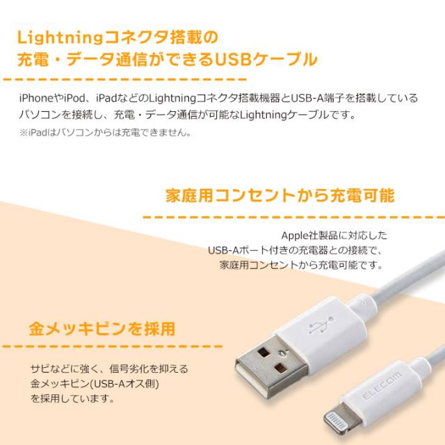 | 使用目的・用途 | USB‐A端子を搭載したパソコン及び充電器とLightningコネクターを搭載したiPhone,iPad,iPodを接続し、充電・データ転送が可能です。 ※iPadはパソコンからは充電出来ません。 |