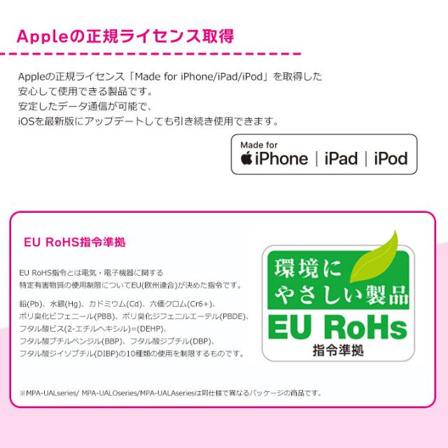 | 使用目的・用途 | USB-C(TM)端子を持つパソコン及び充電器とLightningコネクターを搭載したiPhone,iPad,iPodを接続し、充電・データ転送が可能です。 |