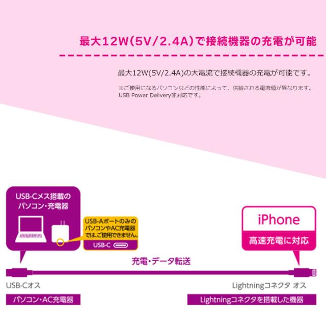 | その他 | ※iPhone8以降に発売されたUSB Power Delivery対応機種とUSB Power Delivery対応の充電器を使用した場合、高速充電が可能 ※iPadはUSB PD対応またはThunderbolt対応のUSB-C(TM)端子を持つパソコンの場合充電が可能 ※USB-C(TM)搭載iPadからLightning搭載端末への給電は可能 |