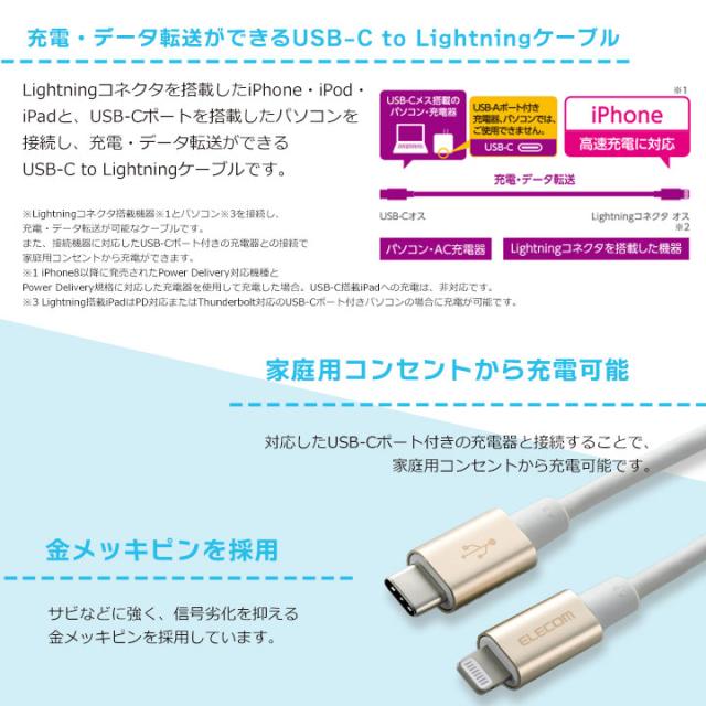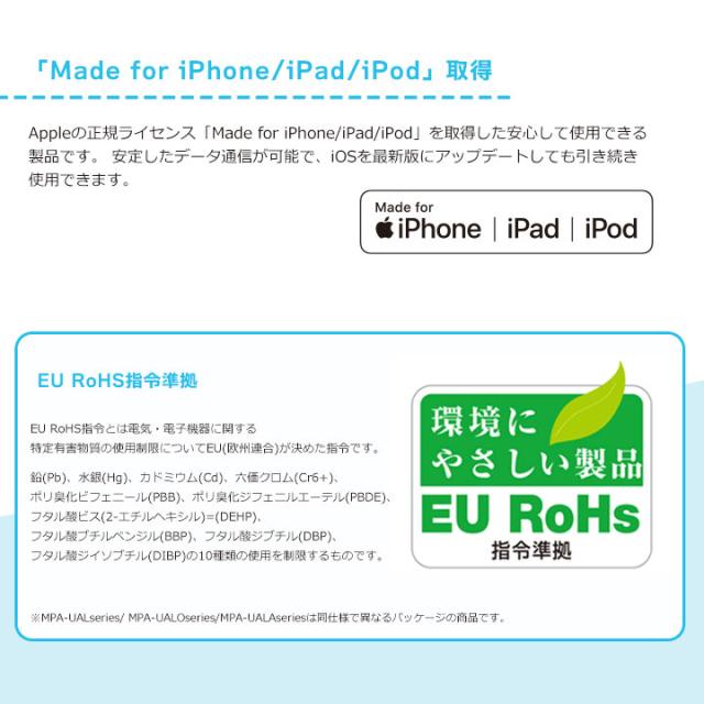| 使用目的・用途 | USB-C(TM)端子を持つパソコン及び充電器とLightningコネクターを搭載したiPhone,iPad,iPodを接続し、充電・データ転送が可能です。 |