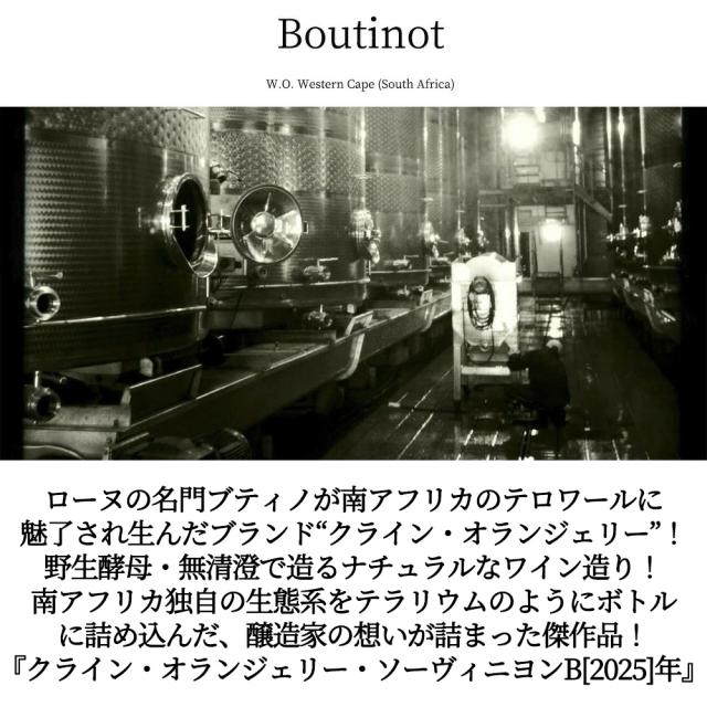 ローヌの名門ブティノが南アフリカのテロワールに 魅了され生んだブランド“クライン・オランジェリー”! 野生酵母・無清澄で造るナチュラルなワイン造り! 南アフリカ独自の生態系をテラリウムのようにボトル に詰め込んだ、醸造家の想いが詰まった傑作品! 『クライン・オランジェリー・ソーヴィニヨンB[2025]年』