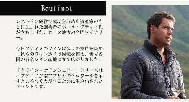 「クライン・オランジェリー」シリーズは、ブティノが南アフリカのテロワールを余すところなく表現するために生み出されたブランドです。 ブティノワイン哲学が反映されたテロワールの表現、独自性、そして高いコストパフォーマンスが魅力となっています。醸造家のホープ、JD・ルソウ氏は自身のことを「レイジー・ワインメーカー(怠惰な醸造家)」と冗談を交えて紹介しますが、カジュアルワインでも野生酵母を積極的に取り入れるなど、品質に妥協しない醸造を心がけています。安定した品質と革新的な技術でワイン造りに取り組む、期待のワインメーカーです。