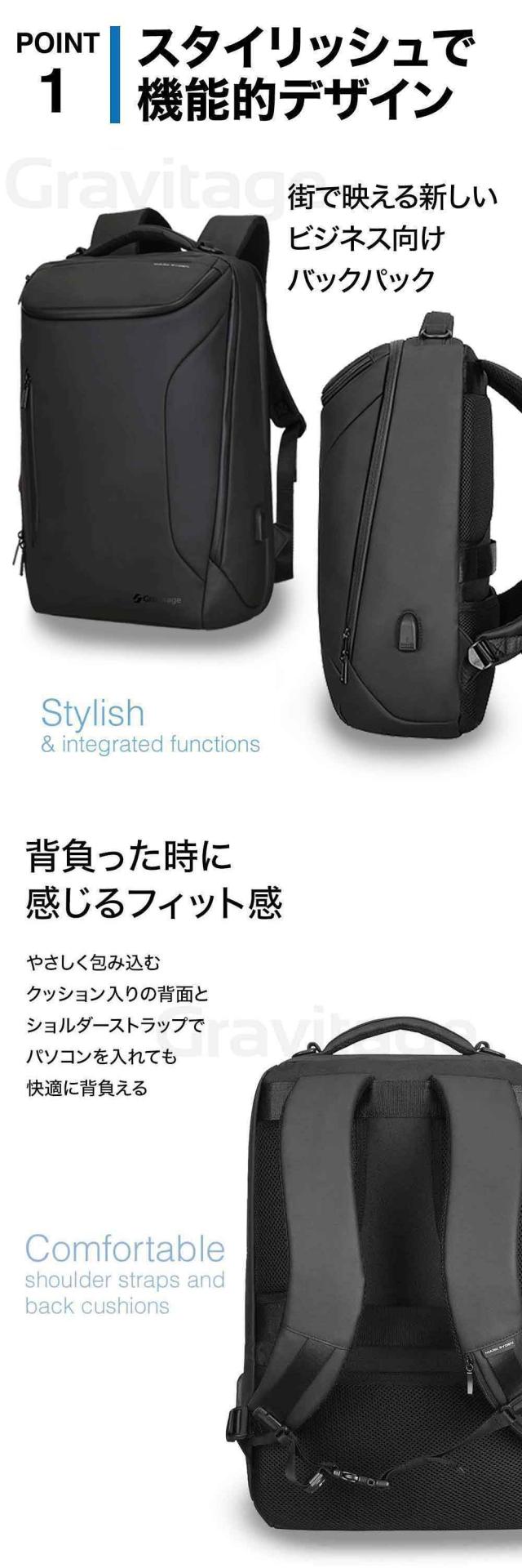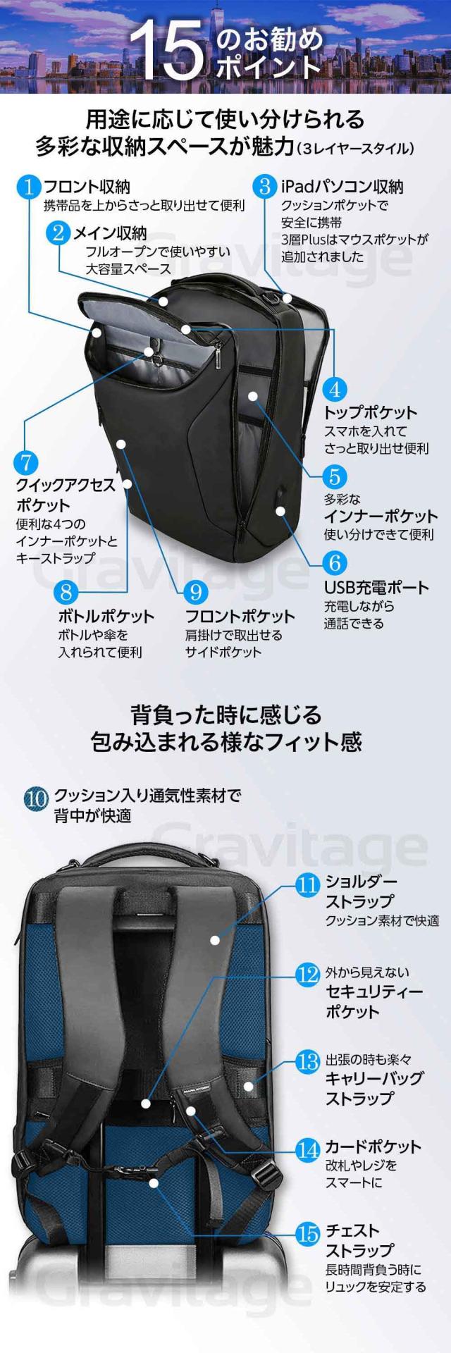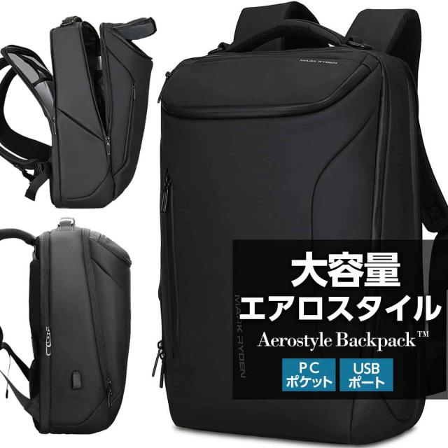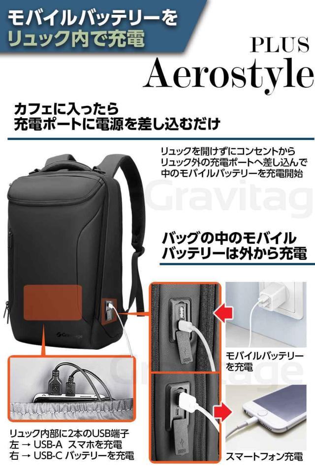 ダブルカードポケットはエアロスタイル プラスをお選びください ![]() ※最初の画像のハートマークをクリックしてください 【30日間返品OK・返送料無料】 当店は、メーカー直接入荷の為品質はご安心頂けます。また、理由によらず商品到着後30日間返品を承っております。ご使用後であっても万が一不具合が発生した場合でも送料無料にて交換対応させて頂いております。 【収納力抜群なポケットで分割収納】 セキュリティポケット・クッション付PCフォルダー・スマホポケット・ドキュメントポケットなど 收納力抜群! 短期旅行など2〜3日分の着替えが楽々収納!キャリーバッグのハンドルに通せる構造で出張や旅行などで便利! 背中部分のセキュリティポケットに財布やパスポートを収納すれば満員電車や海外出張時でも安心! 【YKKジッパー 】 壊れにくいYKKジッパーを使用。キャリーハンドル周囲の縫製も強化。 【通気性】 背面、ストラップ裏面はクッション材の上にメッシュ素材を使用。肩や背中への負担を軽減し通気性も!チェストベルト装備で身体にフィット! 【規格】 サイズは50cm*33cm*20cm、重量はわずか1.1kg。 【ハイグレード素材】 耐水性、耐引掻性、耐引裂性の特殊ナイロン生地と通気性、耐摩耗性のマイクロファイバー合成皮革製! ※表面は撥水素材ですが、YKKジッパーは防水タイプではございません。 【ワンアクションで楽々改札】 ショルダーベルトに取り出しやすいカードスロット! 【ダブルUSBポート付き】 スマホ充電用ポート 1つ目のUSBポートはリュックの中のモバイルバッテリーの 給電側に接続でき、充電しながらスマホ、タブレットを使用できます。 モバイルバッテリー充電ポート 2つ目のUSBポートはモバイルバッテリーの充電側に接続され、 リュックの中にいれたままのモバイルバッテリーをの充電できます。 (USB規格 Type-C) ※モバイルバッテリーは商品に付属しておりません。 ![]() Q.エアロスタイルプラスとエアロスタイルの違いは? A.エアロスタイルプラスには追加機能がございます。 ・パソコン収納スペースにマウスポケットが追加されました。 ・ショルダーストラップの両側にカードポケットが追加されました。 ・ショルダーストラップ内のカードポケットにはキーリールを付けられるフックが追加されています。 ・ロゴが控えめになりブラックでGravitageとなります。 ※エアロスタイルは基本機能は同一ですがエアロスタイルプラスの追加機能がございません。ショルダーストラップのカードポケットは片側のみでキーリールをかけられません。 Q.15.6インチのPCは収納可能ですか? A.はい、収納可能です。 Q.iPhone、Androidの充電は可能ですか? A.可能です。ただし、モバイルバッテリーに関しましては、 付属ではないのでお客様でご用意いただく必要がございます。