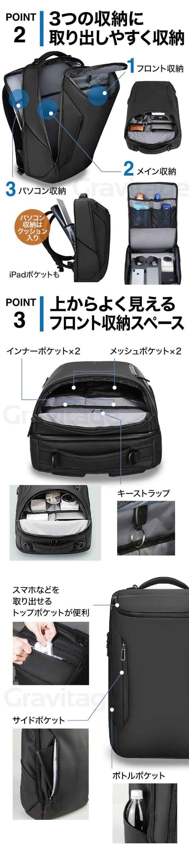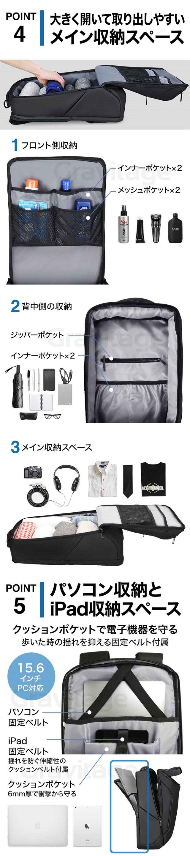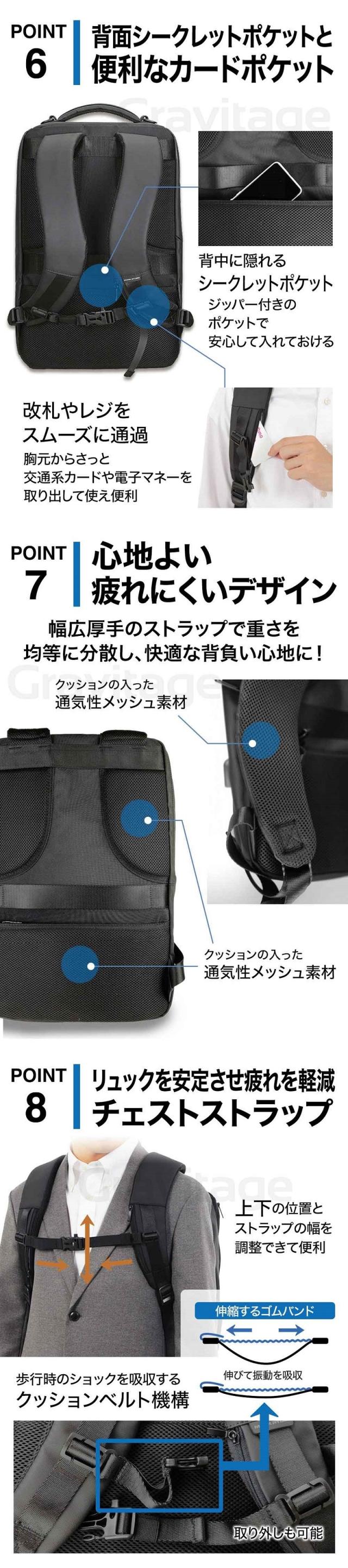 ダブルカードポケットはエアロスタイル プラスをお選びください ![]() ※最初の画像のハートマークをクリックしてください 【30日間返品OK・返送料無料】 当店は、メーカー直接入荷の為品質はご安心頂けます。また、理由によらず商品到着後30日間返品を承っております。ご使用後であっても万が一不具合が発生した場合でも送料無料にて交換対応させて頂いております。 【収納力抜群なポケットで分割収納】 セキュリティポケット・クッション付PCフォルダー・スマホポケット・ドキュメントポケットなど 收納力抜群! 短期旅行など2〜3日分の着替えが楽々収納!キャリーバッグのハンドルに通せる構造で出張や旅行などで便利! 背中部分のセキュリティポケットに財布やパスポートを収納すれば満員電車や海外出張時でも安心! 【YKKジッパー 】 壊れにくいYKKジッパーを使用。キャリーハンドル周囲の縫製も強化。 【通気性】 背面、ストラップ裏面はクッション材の上にメッシュ素材を使用。肩や背中への負担を軽減し通気性も!チェストベルト装備で身体にフィット! 【規格】 サイズは50cm*33cm*20cm、重量はわずか1.1kg。 【ハイグレード素材】 耐水性、耐引掻性、耐引裂性の特殊ナイロン生地と通気性、耐摩耗性のマイクロファイバー合成皮革製! ※表面は撥水素材ですが、YKKジッパーは防水タイプではございません。 【ワンアクションで楽々改札】 ショルダーベルトに取り出しやすいカードスロット! 【ダブルUSBポート付き】 スマホ充電用ポート 1つ目のUSBポートはリュックの中のモバイルバッテリーの 給電側に接続でき、充電しながらスマホ、タブレットを使用できます。 モバイルバッテリー充電ポート 2つ目のUSBポートはモバイルバッテリーの充電側に接続され、 リュックの中にいれたままのモバイルバッテリーをの充電できます。 (USB規格 Type-C) ※モバイルバッテリーは商品に付属しておりません。 ![]() Q.エアロスタイルプラスとエアロスタイルの違いは? A.エアロスタイルプラスには追加機能がございます。 ・パソコン収納スペースにマウスポケットが追加されました。 ・ショルダーストラップの両側にカードポケットが追加されました。 ・ショルダーストラップ内のカードポケットにはキーリールを付けられるフックが追加されています。 ・ロゴが控えめになりブラックでGravitageとなります。 ※エアロスタイルは基本機能は同一ですがエアロスタイルプラスの追加機能がございません。ショルダーストラップのカードポケットは片側のみでキーリールをかけられません。 Q.15.6インチのPCは収納可能ですか? A.はい、収納可能です。 Q.iPhone、Androidの充電は可能ですか? A.可能です。ただし、モバイルバッテリーに関しましては、 付属ではないのでお客様でご用意いただく必要がございます。