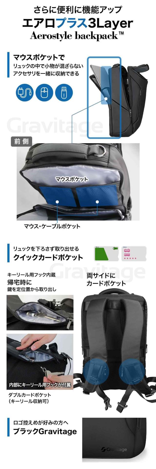 大人気のグラビテージエアロスタイルにPLUS版が登場。パソコンのアクセサリ用にマウスポケットをご用意しました。更にショルダーのカードポケットにキーリールも内蔵できて便利になりました。もちろん基本機能はそのままでバージョンアップ、リュック中央のロゴ表記もビジネス向けに控えめなブラックGravitageになりました。