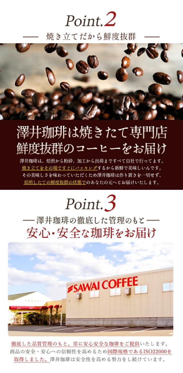 澤井珈琲(さわいこーひー)では、お客様のお家に商品が届き、箱を開けた瞬間。そして、トレードマークの赤いコーヒー袋の封を開けた時に鮮度抜群の「香り高さ」と、飲んだときの「味わい」に感動して頂けるように、レギュラーコーヒーはご注文を頂いてから焙煎をして焼きたてのコーヒー、コーヒー豆、珈琲、珈琲豆をお届けをしている焼き立て珈琲専門店です。お客様に「美味しい」と言って喜んで頂く事が私たちの喜びと思っております。「美味しいコーヒーをお届けしたい」と想い続けて生まれたこだわりの味を、どうぞ、この機会にお楽しみくださいませ。澤井珈琲では、コーヒー豆は挽き方がご選択いただけます。珈琲豆を挽く事をお楽しみ頂ける『豆のまま』や、私共の専用の特注サイズの大型のミルで挽いて、コーヒー粉の状態にしてお届けする方法がございます。中挽き、細挽き、粗挽き、荒挽きなど様々な挽き方がございますが、私共がお薦めする『店長のおすすめ挽き』にて、そのコーヒーに合った一番美味しいと思える挽き方に挽いてお届けします。東京の銀座にも実店舗を構える安心安全な澤井珈琲で楽しいお買い物をお楽しみください。よく間違えられる名前として、沢井珈琲、沢井コーヒー、澤井珈琲店、澤井珈琲本店、さわいこーひー、サワイコーヒーなどがございますが、正式名称は澤井珈琲となります。