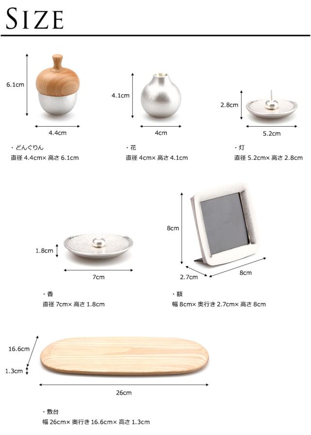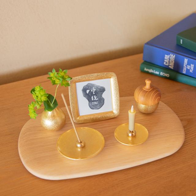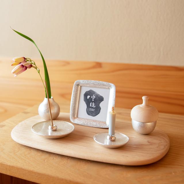 暮らしの空間に優しくなじむ可愛い祈りの道具「まどかセット」。どんぐりん(おりん)、香、灯、花、額、敷台の6点セットです。まわりを森のように優しい空気で満たします。