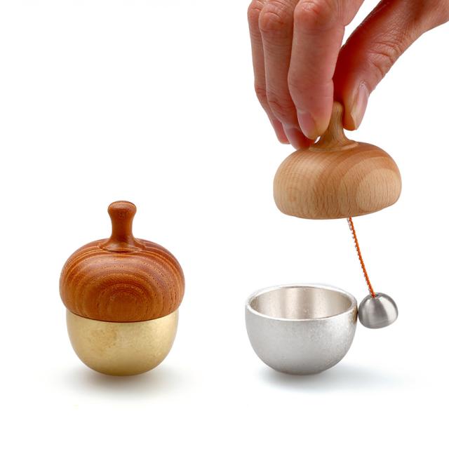 どんぐりん:どんぐりの中にしまわれた振り子でおりんを鳴らします(特許出願中)。木製の蓋をつまみ振り子で鳴らす動作は、多忙な日常を忘れさせてくれるような丁寧で心落ち着くひとときを感じさせてくれます。 可愛らしいデザインにマッチした、澄んだ明るい音色です。