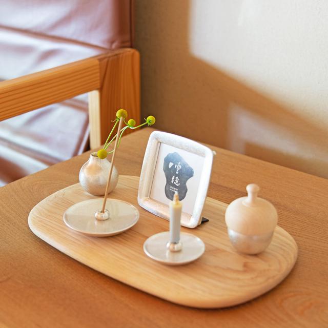 敷台:縁をふんわりとカーブさせた温かみある木製の敷台。ゆとりのある大きさなので、お手持ちの小物と合わせたお好みのレイアウトでもお使いいただけます。