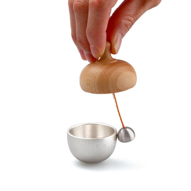 まるく柔らかな曲線を描く癒しと祈りの道具「どんぐりん」。どんぐりの中にしまわれた振り子でおりんを鳴らします(特許出願中)。