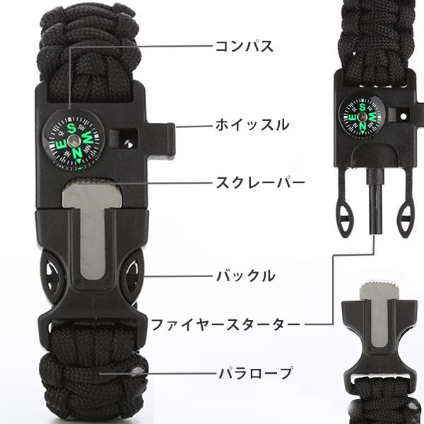 サバイバル ブレスレット 防災グッズ 多機能 アウトドア コンパス 方位磁針 方位磁石 笛 ホイッスル スクレーパー ファイヤースターター パラロープ 送料無料