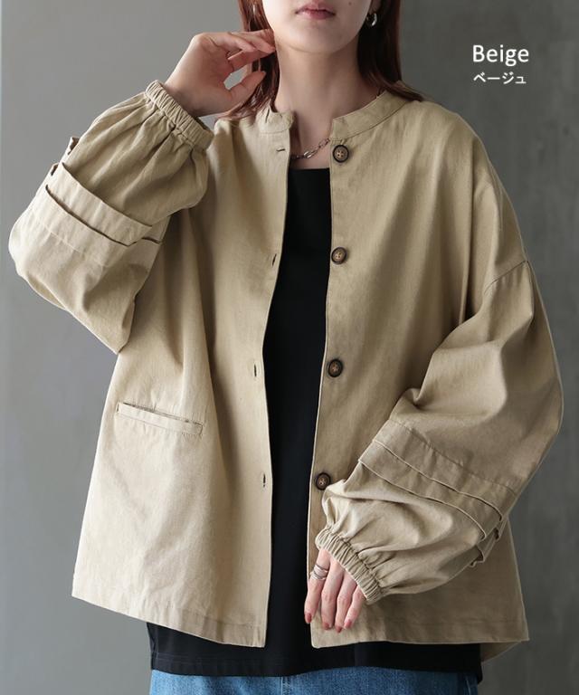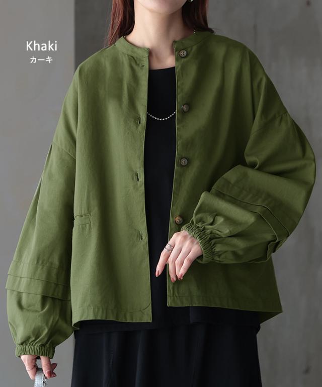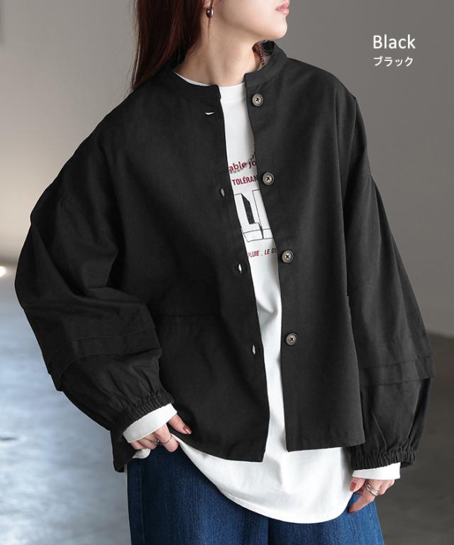晩夏〜秋物 “ ジャスト丈 ” ジャケット アウター レディース ぽわん袖 ブルゾン 綿100% 長袖 羽織 ノーカラー タック ツイル コクーン ライトアウター 体型カバー ゆったり おしゃれ 無地 ドロップショルダー 大きいサイズ 黒 カーキ 春 夏 HUG.U 秋新作