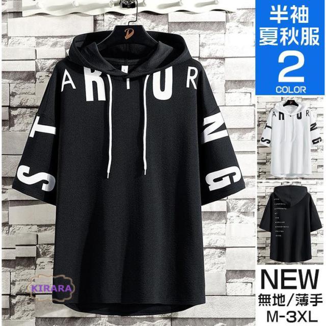 プルオーバーパーカー メンズ 半袖 フード付き プリント レイヤード スリム Tシャツ トレーナー 夏物 薄手 速乾 カジュアル ジャージ スポーツ アウター 涼しい おしゃれ 運動着 夏新作 大きいサイズあり
