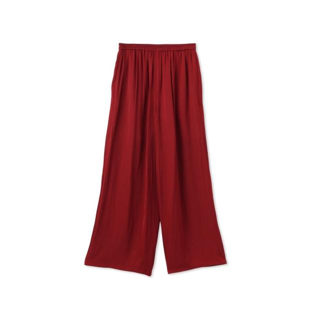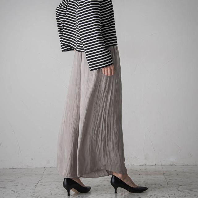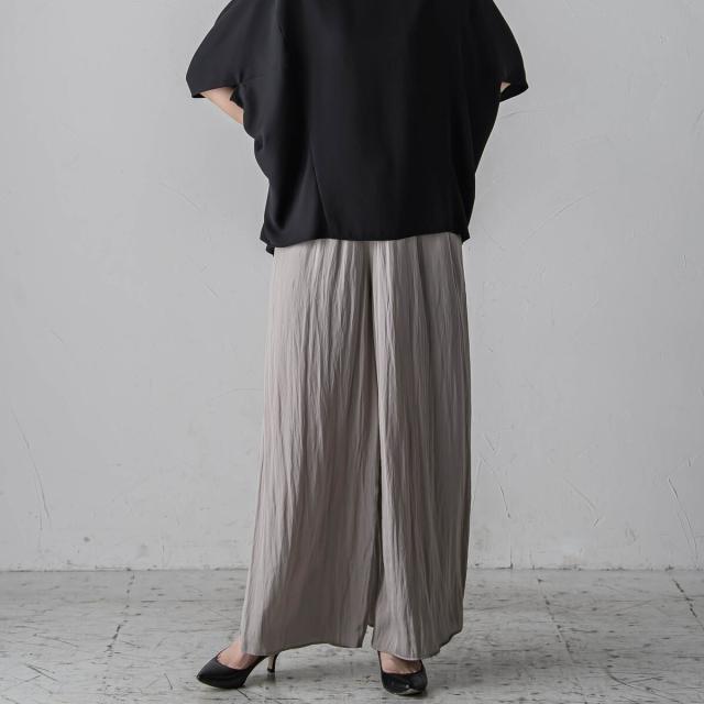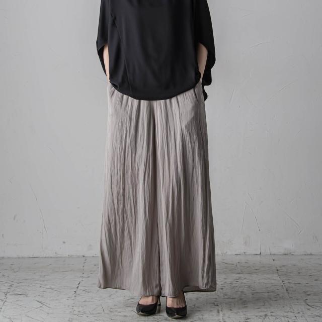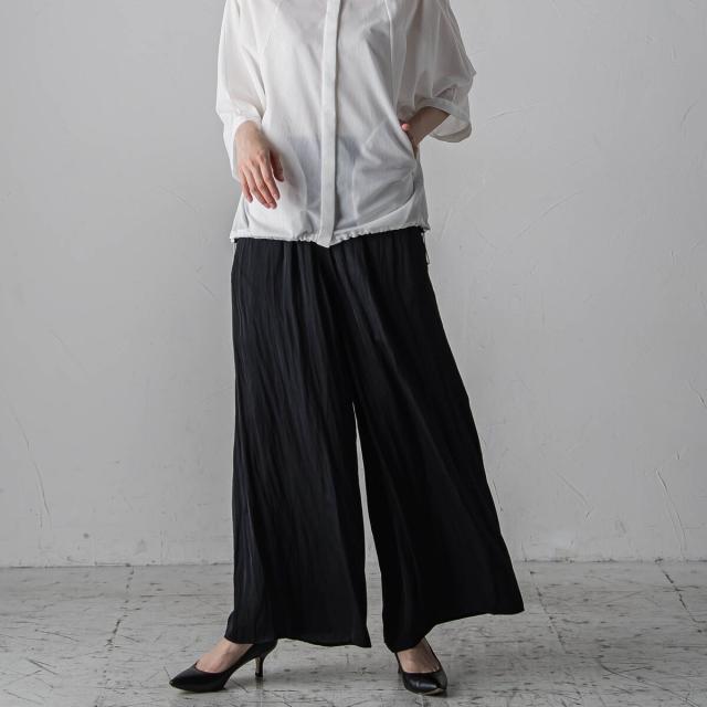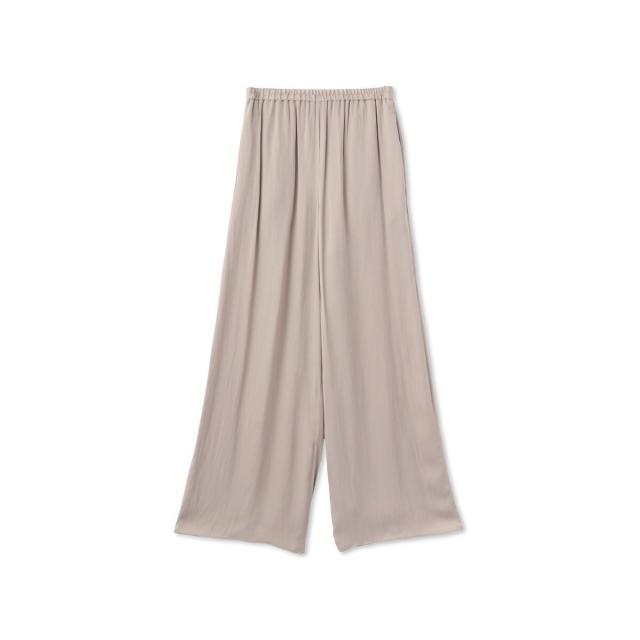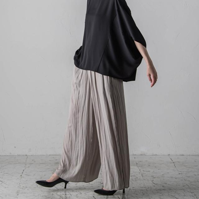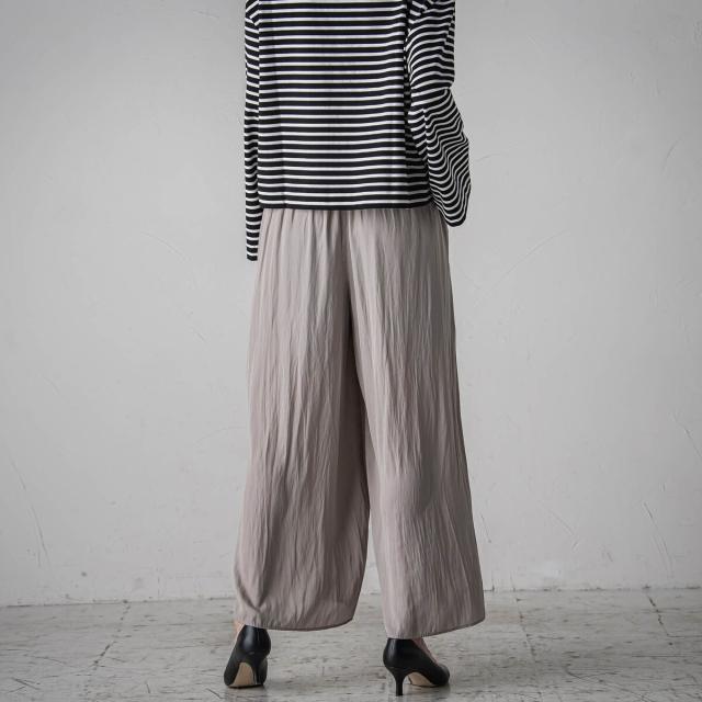 パウダータッチで優しいタッチが特徴の割繊素材を使用したギャザーワイドパンツ。