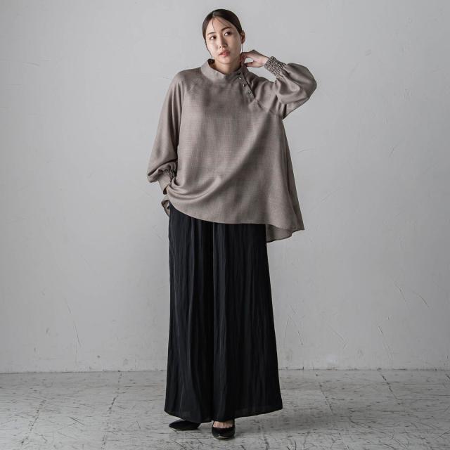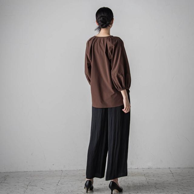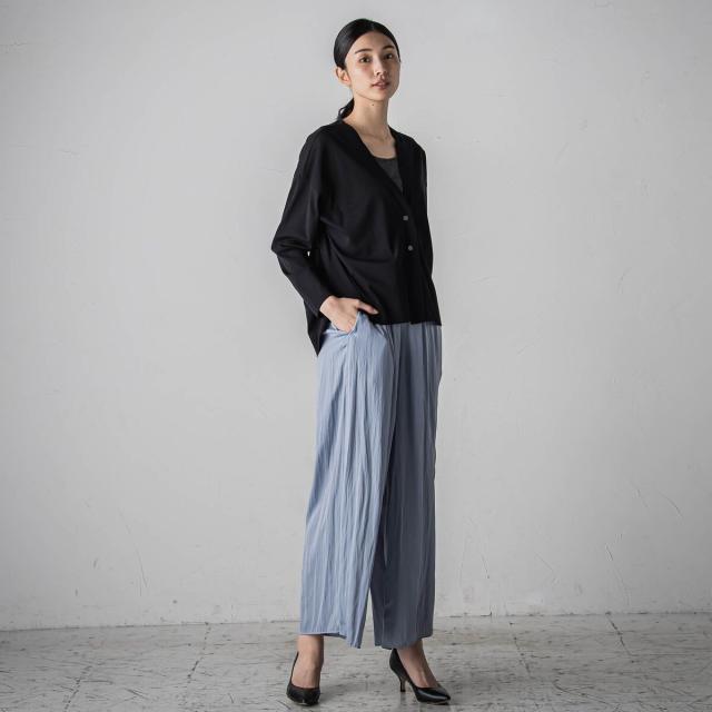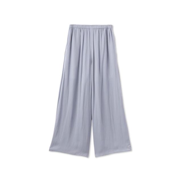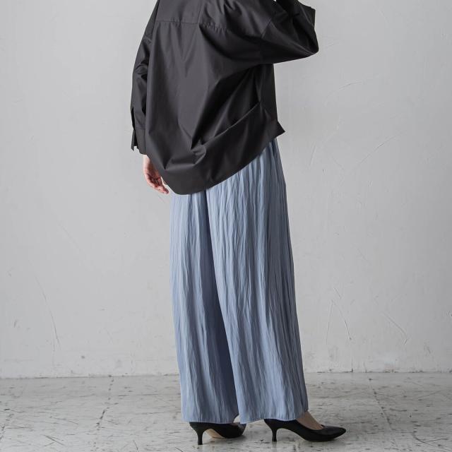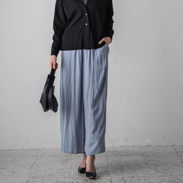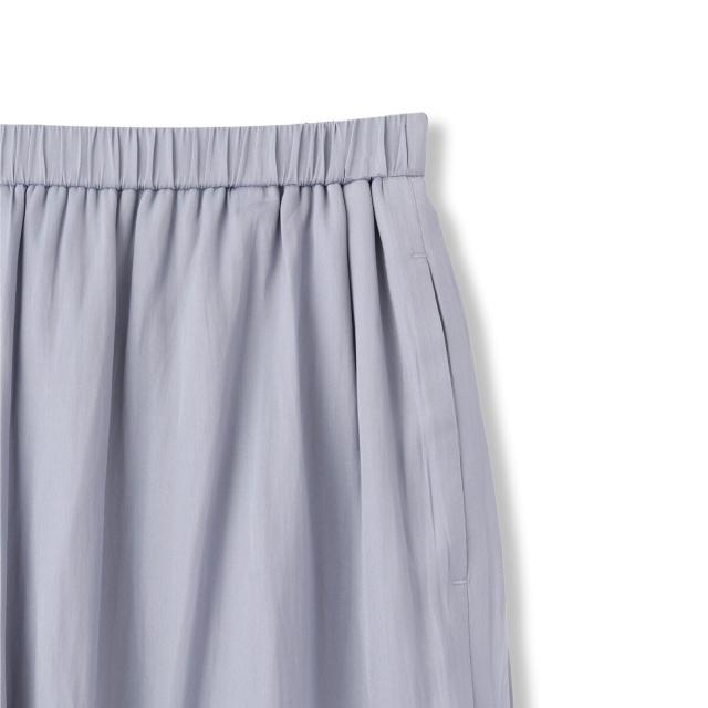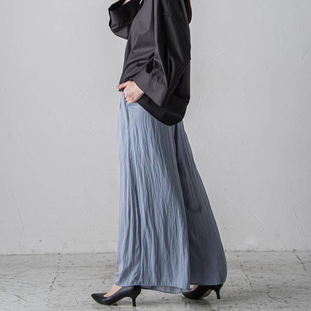パウダータッチで優しいタッチが特徴の割繊素材を使用したギャザーワイドパンツ。