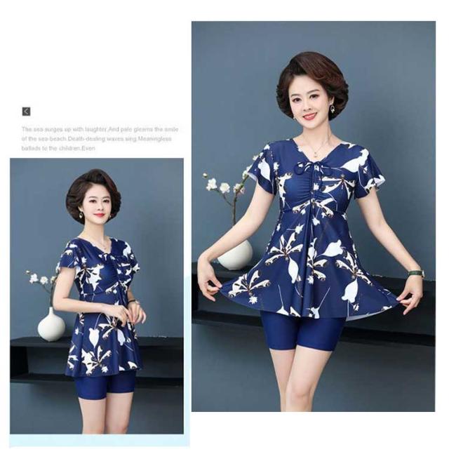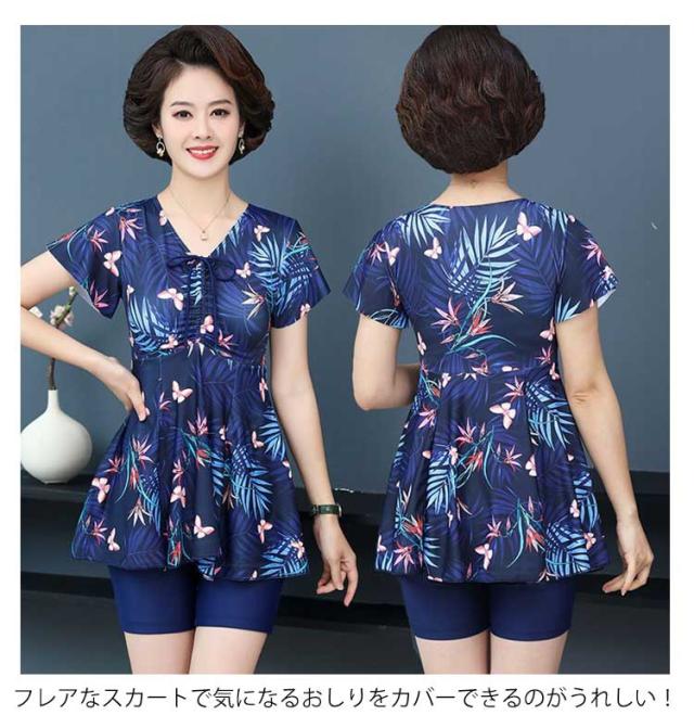 水着 レディース セパレート 体型カバー ワンピース ショートパンツ スイムキャップ セット シニア スイムウェア UVカット ママ水着 保守 中高年 温泉 お母さん 海 ブルー 温泉 着痩せ 露出控えめ おしゃれ 花柄