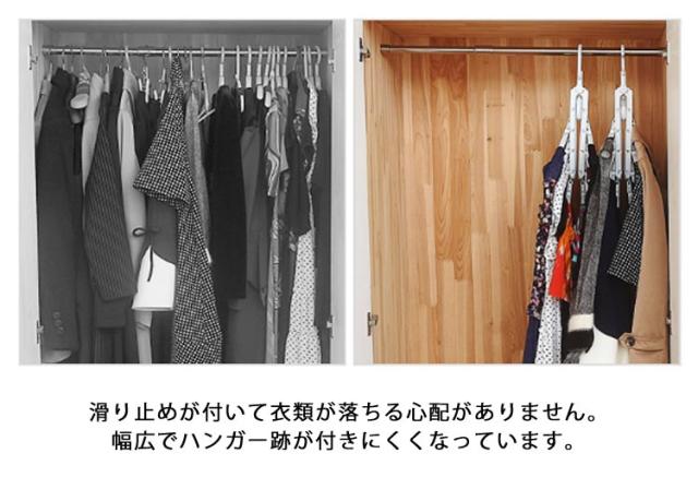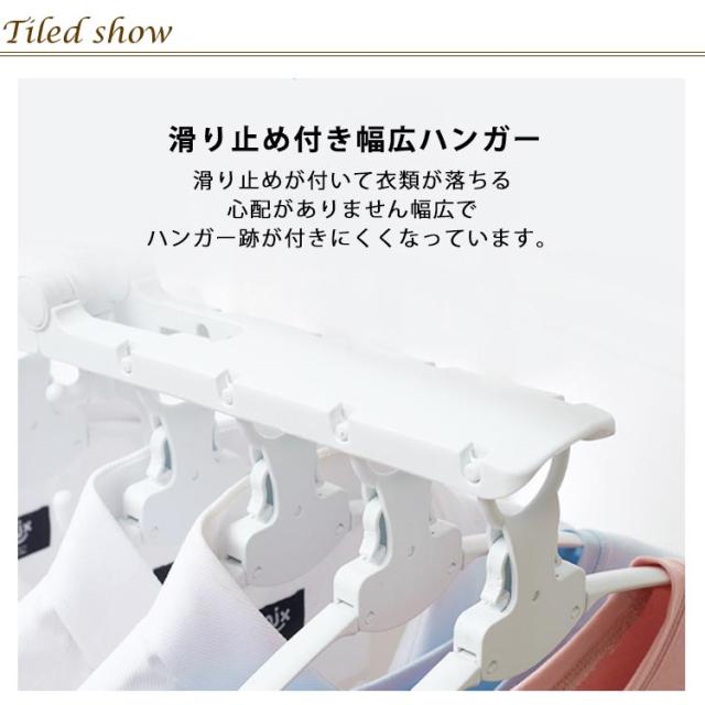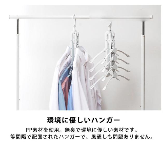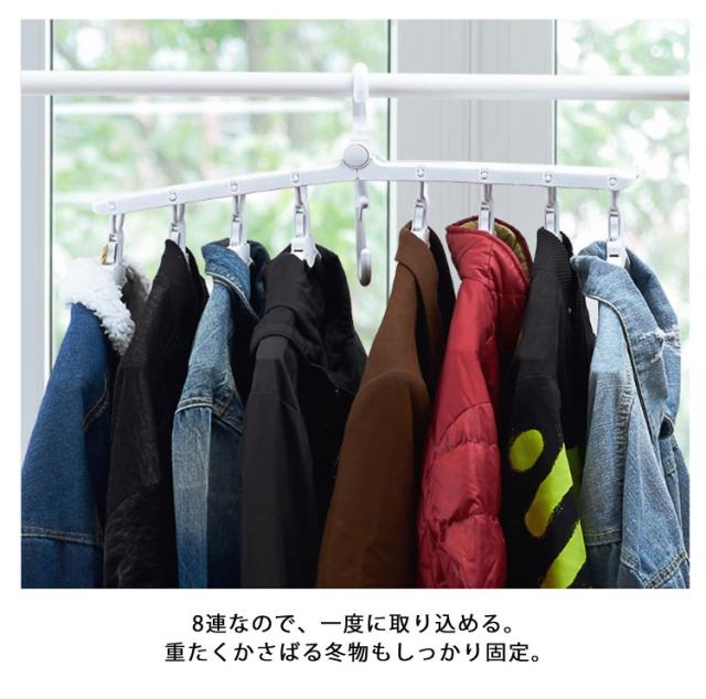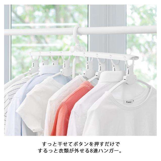 | 折り畳み式・ワンタッチ8連ハンガー 【2個セット】 すっと干せてボタンを押すだけで するっと衣類が外せる8連ハンガー。 折りたたんでクローゼットに収納。 大切な衣類の首元を伸ばさず着脱ができます。 8連なので、一度に取り込める。 本体を折りたたんだまま衣類を掛けることができます。 360°回転するので好きな方向に干すことができます。 重たくかさばる冬物もしっかり固定。 滑り止めが付いて衣類が落ちる心配がありません。 幅広でハンガー跡が付きにくくなっています。 <お勧めポイント> ●滑り止め付き幅広ハンガー 滑り止めが付いて衣類が落ちる心配がありません幅広でハンガー跡が付きにくくなっています。 ●360度回転 自由に回転するので好きな方向に干すことができます。 ●環境に優しいハンガー PP素材を使用。無臭で環境に優しい素材です。等間隔で配置されたハンガーで、風通しも問題ありません。 | |