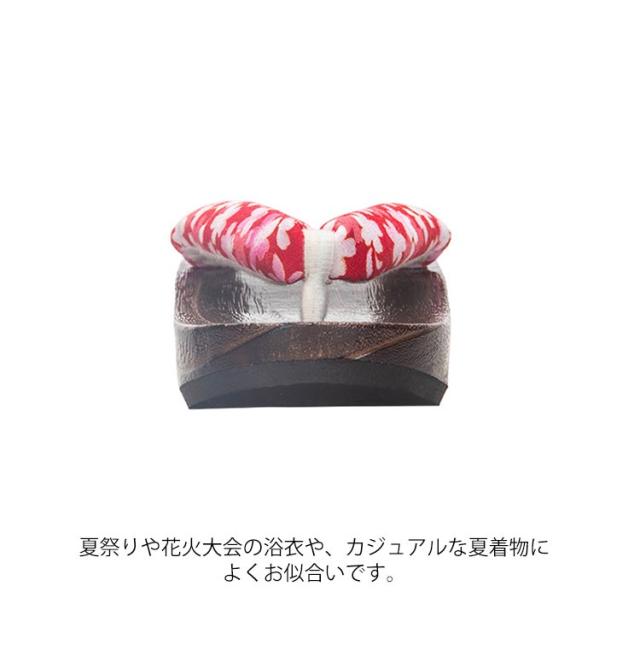 | 浴衣にぴったり可愛い和柄! 夏や暖かい季節におすすめな、子供用下駄です。 幅広で柔らかい鼻緒は足に優しく、たくさん歩かれる日でも靴擦れしにくいように工夫しています。 夏祭りや花火大会の浴衣や、カジュアルな夏着物によくお似合いです。 | |