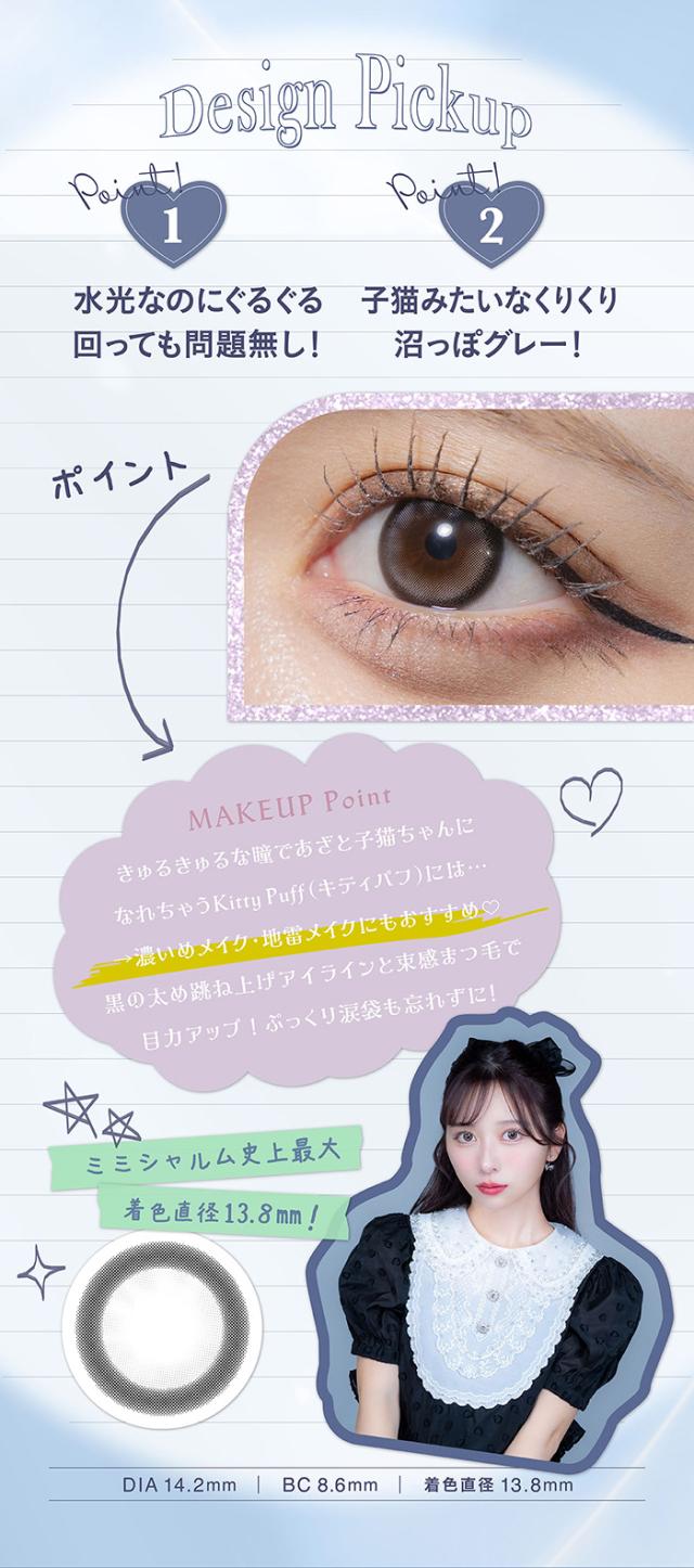 | 着色直径 | 13.0mm:ムーンラテ/ロイヤルムーン 13.5mm:ハニーシロップ/ジェムグレージュ 13.6mm:ドーリードロップ 13.8mm:キティパフ |