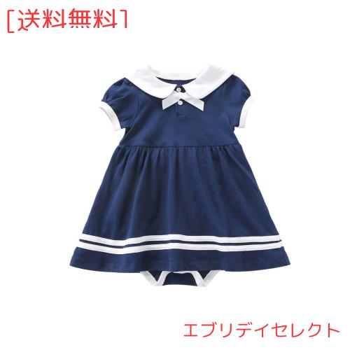 [Baby Nest] 夏 ベビー服 スカート付き 半袖ロンパース 赤ちゃん ワンピース 女の子 セーラー風 水玉 コットン100% ネビー 6-9ヶ月