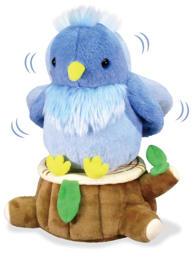 モノマネする幸福の青い鳥が登場!ものまねしながら羽をパタパタ、体もぴょこぴょこ動きます。鳥が座る切り株は便利な小物入れ機能付き! 21x19x23cm