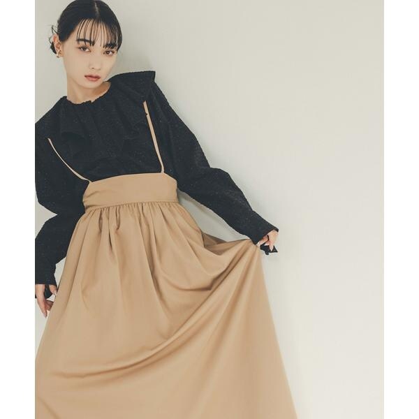 華奢なサスペンダーが女性らしいポイントのスカートです。バックスタイルは少しカットアウトされたデザインがアクセント。サスペンダーは長さ調節ができます。中にカットソーやニットを合わせ、季節感のあるコーディネートを楽しめます。