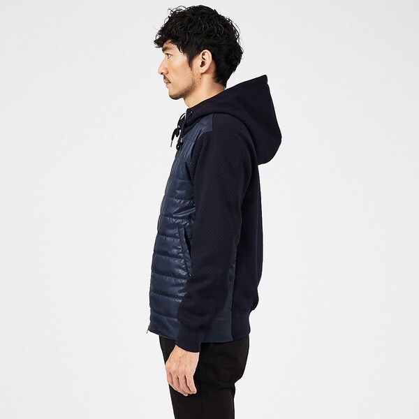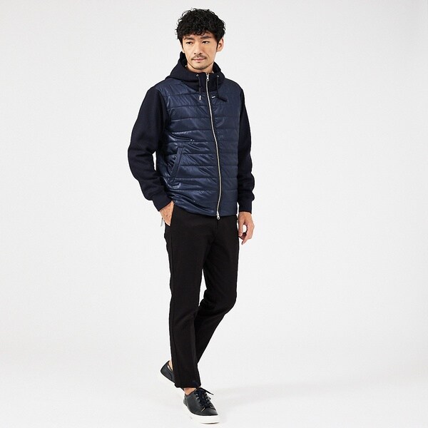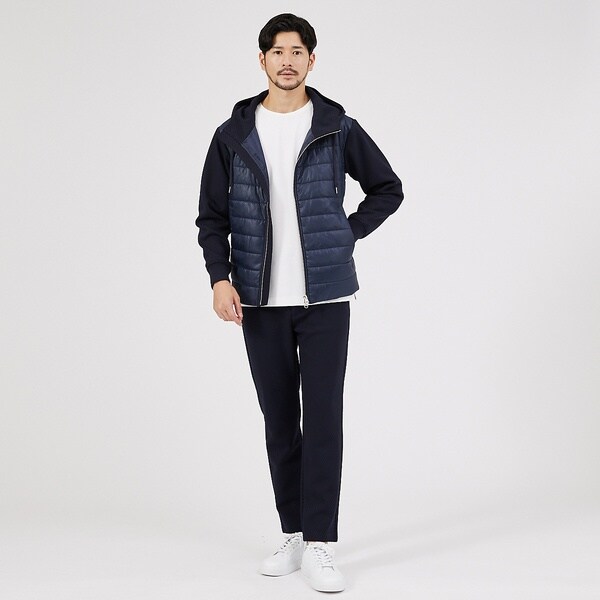 ネックのパーカー部分まで繋がるハイポイントのフロントジップで、旬なスポーティーカジュアルを演出できます。 ライトアウターとしてはもちろん、コートのインナーとしても重ね着できるよう タイトでスマートなシルエットに仕上げました。 袖と後ろ身頃はストレッチのあるポンチ素材で動きやすさも魅力です。