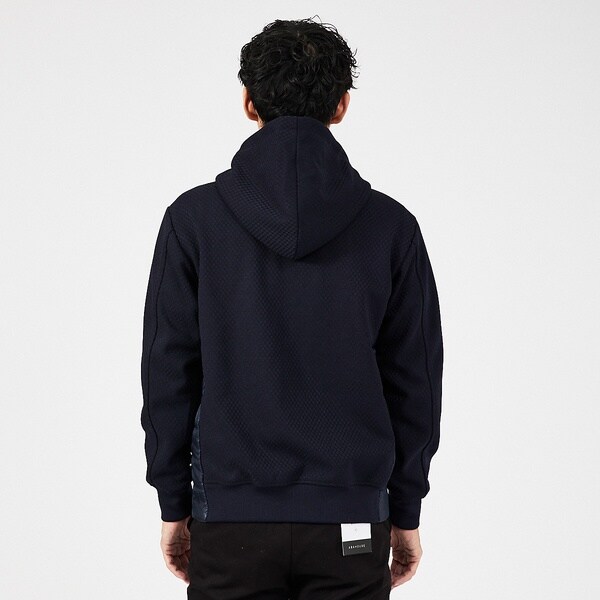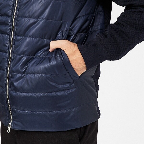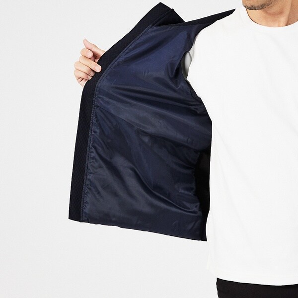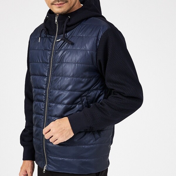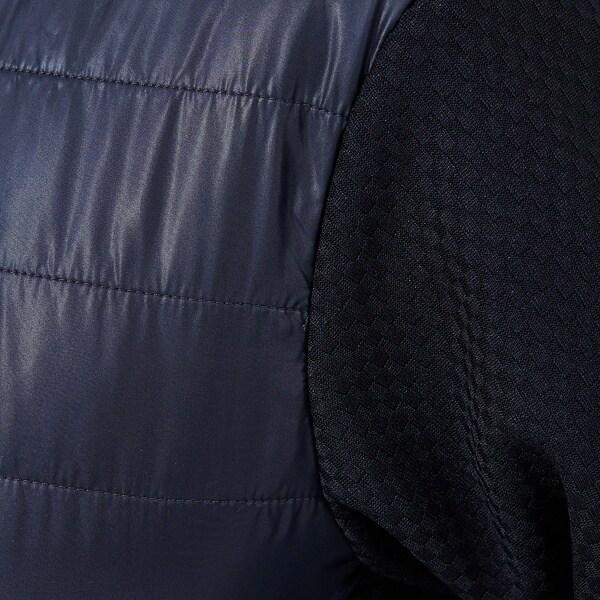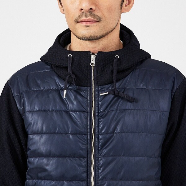 しっかりした肉感のポリエステルポンチ生地に、凹凸あるチェック柄ニットジャガード素材を 張り合わせたストレッチ性と反発性に優れたオリジナル素材を使用。 肉厚ながらも軽くて暖かく、保温性に優れた素材になっています 前身頃には、中綿を入れナイロンタフタとコンビデザインに仕上げました。