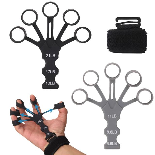 【商品仕様】セット内容:2個指ストレッチャー ; 強度調節:グレー6.6LB、8.8LB、11LB、ブラック13LB、17LB、21LB ;本体サイズ:縦12cm×横11cm 穴径1.8cm/横高2.8cm ;素材:シリコン 包装内容明細書:2*指ストレッチャー、2*リストバンド