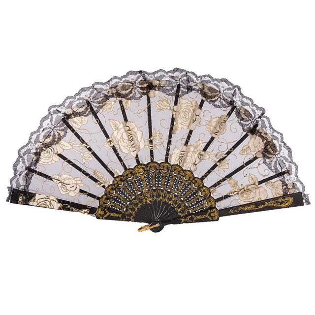 ブラック LOYELEY レース扇子 フラワーファン 薔薇 バラ柄 折りたたみ式 ダンス 踊り スペイン ドン・キホーテやスペインの踊り バレエ バレエ用品 練習用 ダンスパフォーマンス用 (ブラック)