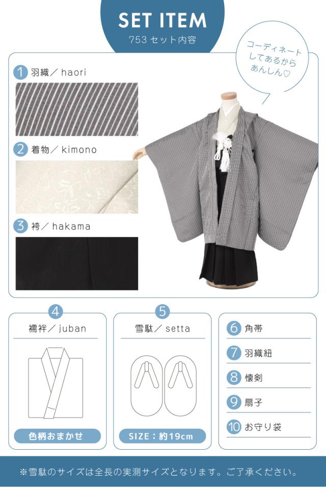 セット内容は【羽織・着物・半襦袢・袴・帯・羽織紐・扇子・懐剣・お守り袋・雪駄】です。