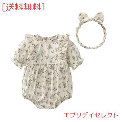 [Reegoo Peter] ベビー服 女の子 ボディスーツ 夏 ロンパース 半袖 赤ちゃん服 綿100% 新生児服 ヘアバンド かわいい 花柄 カーキ 80 9-
