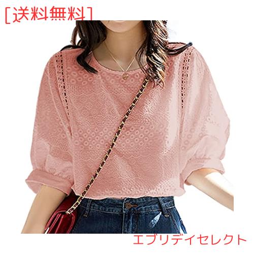 [Yino] (イノ) レース シャツ ブラウス レディース トップス 小花 刺繍 半袖 Uネック 透かし編み 着痩せ 可愛い おしゃれ ボリュームス