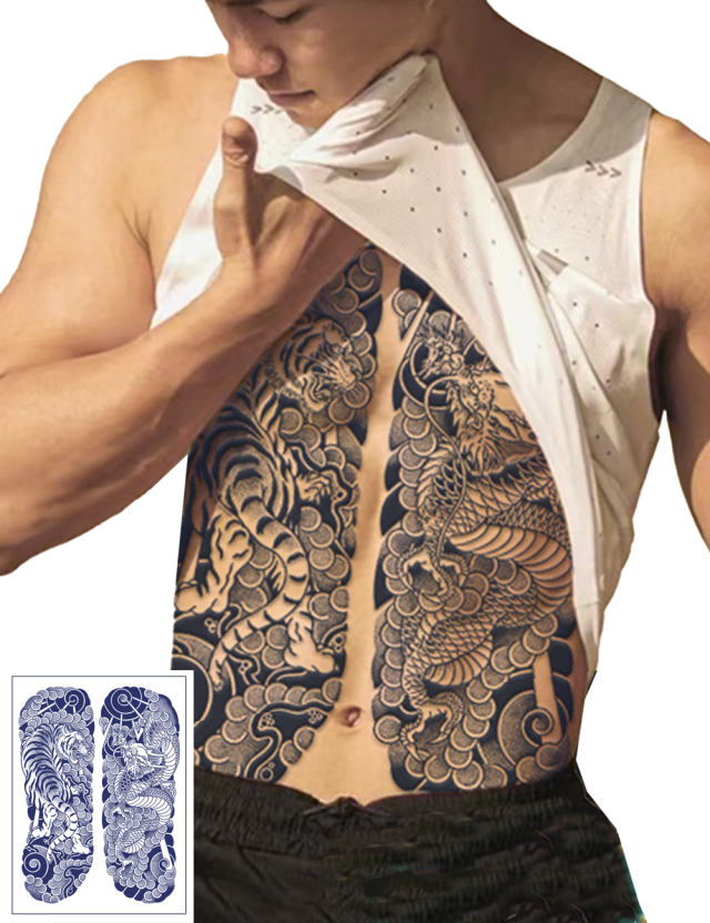 ジャグアタトゥーシール、2週間、メンズ用胸タトゥー、ヘナタトゥー、刺青シール、龍と虎柄、長持ち防水、おしゃれな和彫りボディーシール