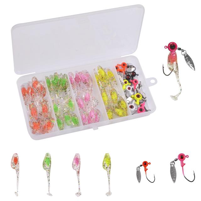 50pcs(40pcsシングルテールワーム+10pcsブレード付きジグヘッド) アジング メバリング バス釣り ワームセット ライトゲーム ジグヘッドワームセット ピンテールワーム ブレード付きジグヘッド 1.75g 3.5g 1.95inワーム 多種爆釣色 ケース付き 50pcsセット