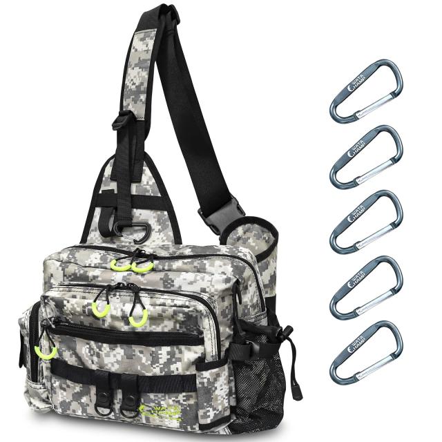 カモしろい WATACHAMP【ワタチャンプ】釣り バッグ ウエストバッグ フィッシングバッグ 防水 5つカラビナ付き ダブルファスナー 可動式肩パッド 着脱式ウエストベルト タックルバッグ 多機能 大容量 釣り ショルダーバッグ 【 カモしろい 】