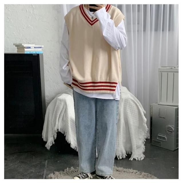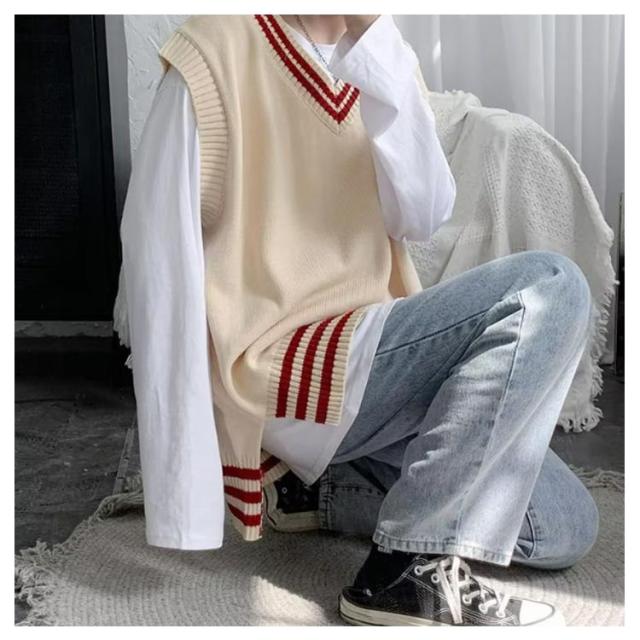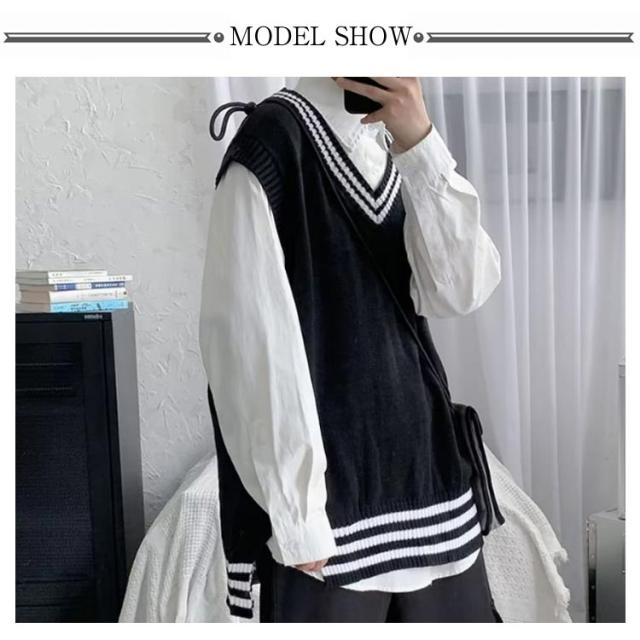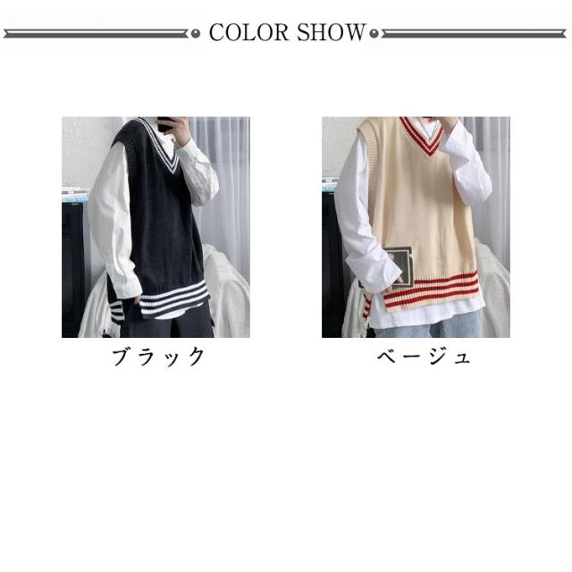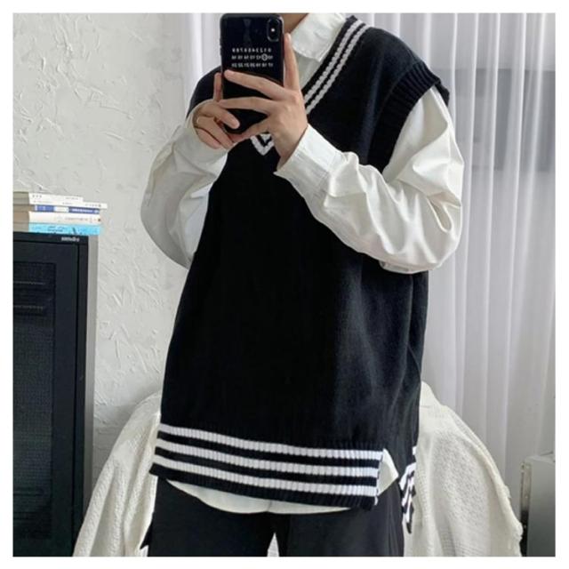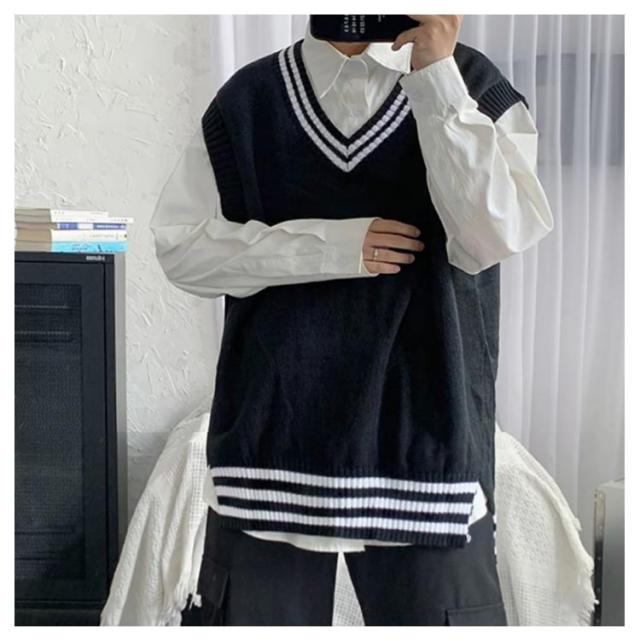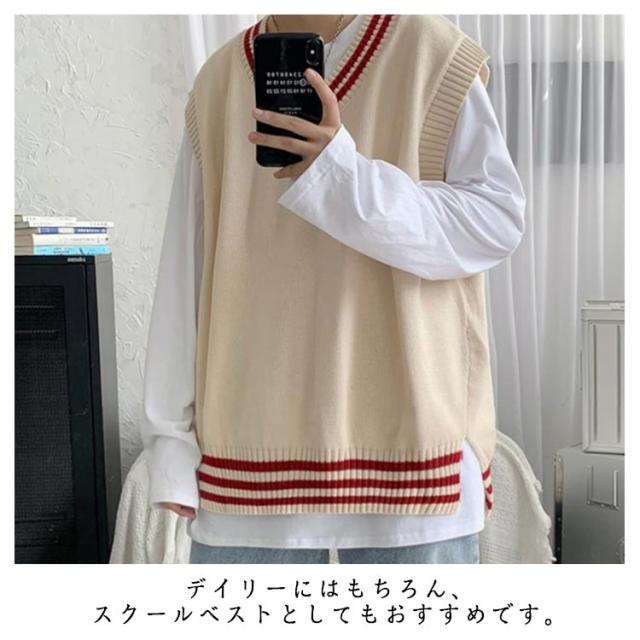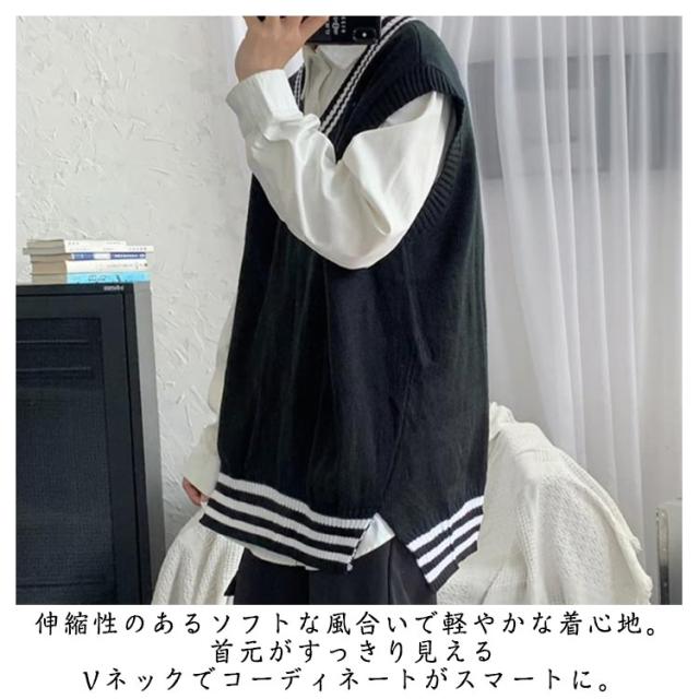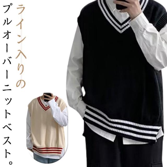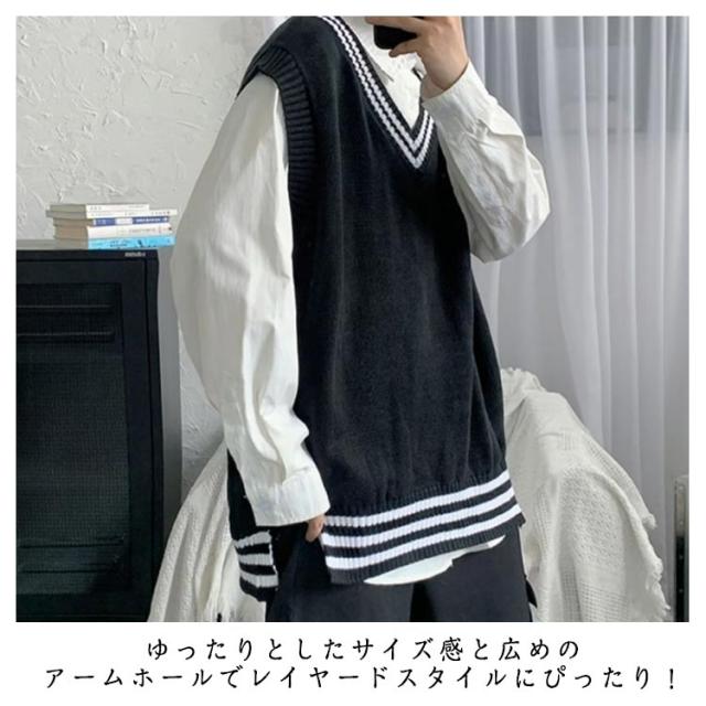 リブニット ストリート系 ニットベスト メンズ トップス ノースリーブ セーター ライン入り レイヤード インナー リブニット カジュアル プルオーバー 重ね着 スクール