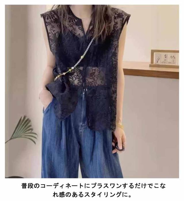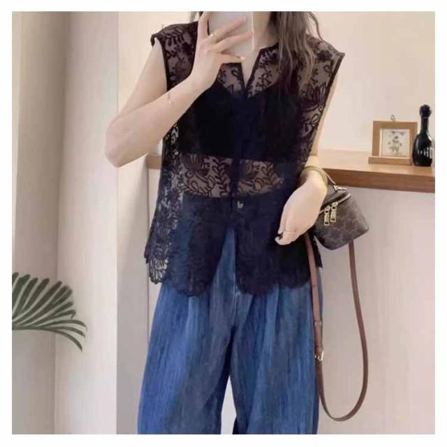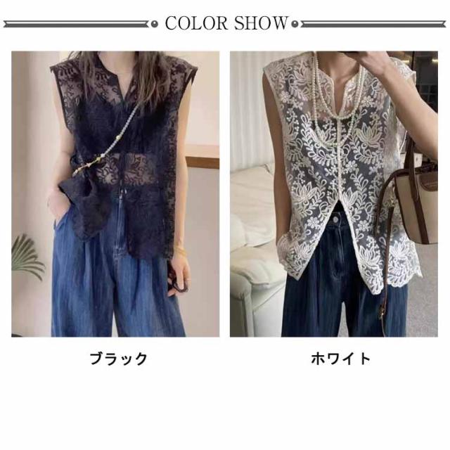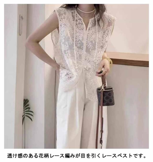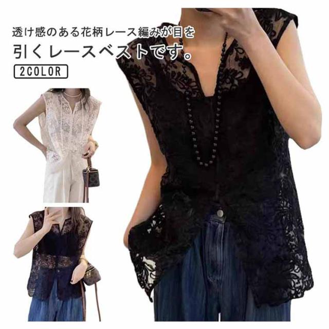 サマーベスト 大人可愛い ジレ レディース ベスト シアー レースベスト 総レース 透かし編み レース 花柄 レース 上品 刺繍 薄手 羽織り ノースリーブ レイヤード ゆったり vネック トップス ベスト 体型カバー 白 黒 春 夏