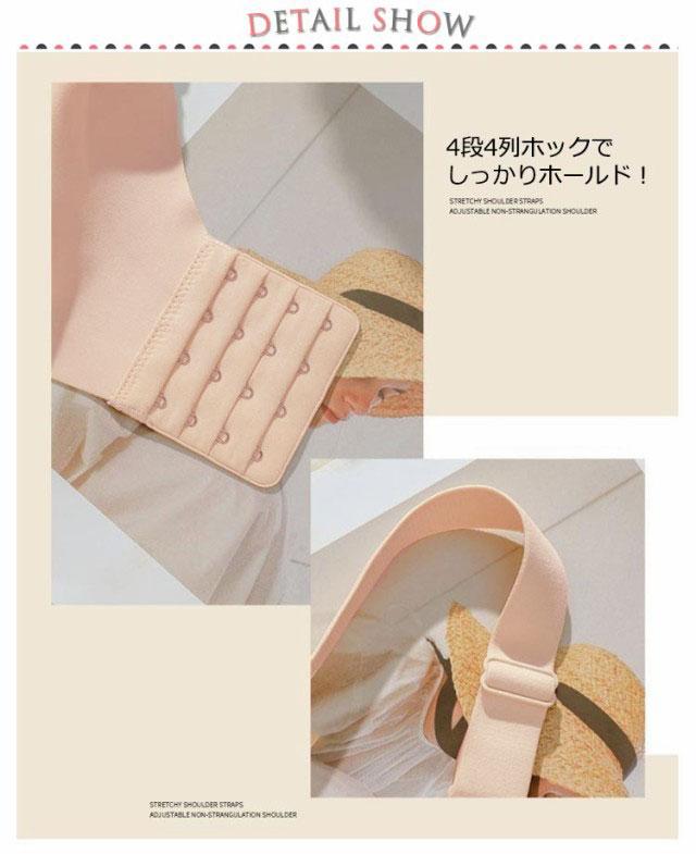 | 5colors×5size! 大きな胸を小さく見せるブラ。軽やかな素肌感覚 でしっかりサポート! バストをしっかりホールドする独自設計を確立運動時の揺れからしっかり守ってホールド! 高い弾性のある肩は、胸をしっかりと包み込んで引き締め、視覚的に小さく見せる効果があります。 脇の下までカバーする超脇高仕様、サイドをしっかりガード。 柔らかくてワイヤーフリー、自由に巻いていただけます。 バックのU字型ストラップが背中のラインをスッキリ見せる。 4段4列ホックでしっかりホールド! | |