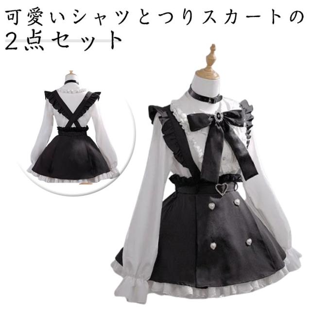 吊りスカート 4点セット ロリータ 可愛い ワンピース 可愛い 学院風 チョーカー リボン 地雷系 参戦服 セットアップ ゴスロリ レディース 上下セット 長袖 量産型 森ガール Aライン フリル きれいめ お姫様 おしゃれ デート おしゃれ
