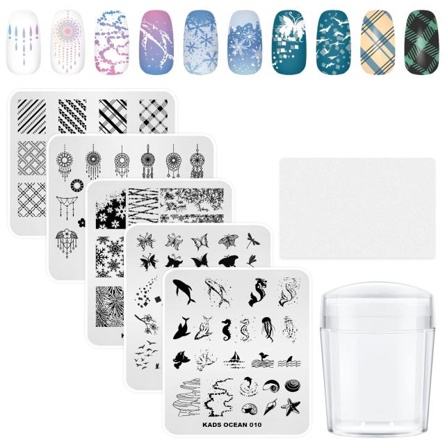 セット5 KADS ネイルスタンププレートセット(5枚プレート+1スタンプ+スクレーパー) イルカ/海馬/バタフライ/クリスマスツリー ネイルイメージプレート (セット5)