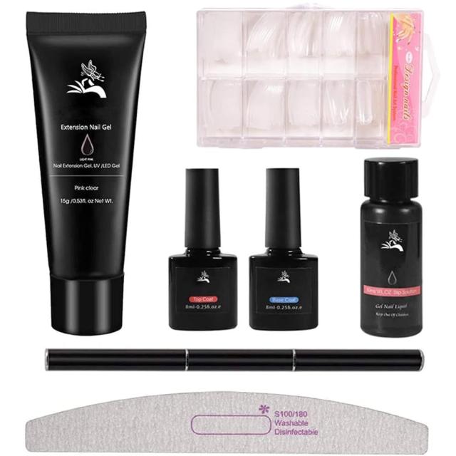 【セット内容】長さだしジェル 1ボトル;専用液 1本;専用ネイルペン 1本;長さ出しチップ 100枚(10サイズ*各10枚);ネイルヤスリ1本;ベースコート(8ml);トップコート(8ml)。