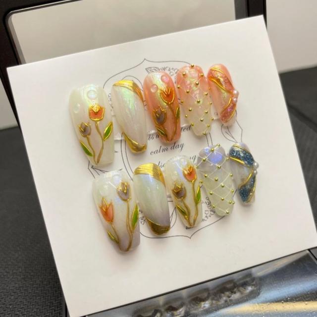 S_#40 GIGIBO ネイルチップ 手作り 10枚入 つけ爪 3D ロング ミディアム シェル パール キラキラ ピンク 人気 おしゃれ 可愛い デザイン 付け爪 Nails #40 S