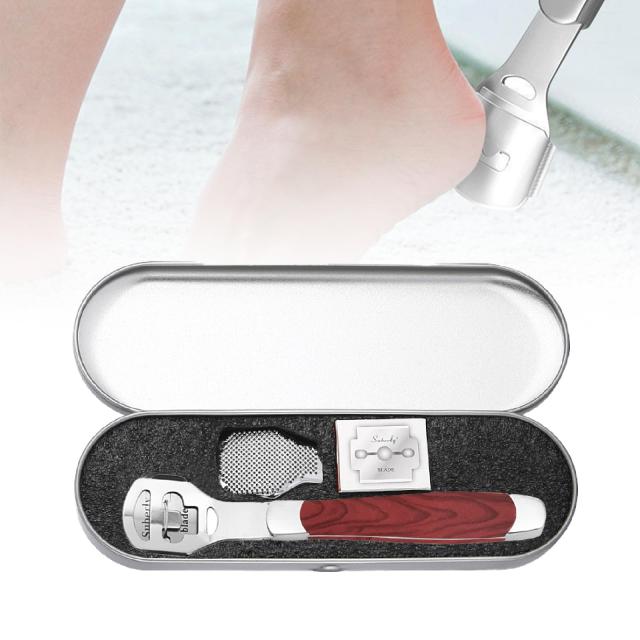【仕様】木の柄を模してサイズ:14×3cm;ソリッドウッドシャンクサイズ:13.8×3cm;ステンレスハンドルサイズ:14.8×2.8cm;替刃10枚付き、脚揉み用ネット1個、収納盒付き。