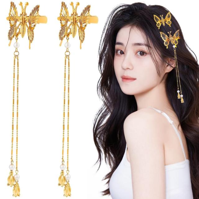 バレッタ バタフライ 蝶タッセルサイドクリップ 2個セット 蝶のヘアピン ムービングバタフライヘアクリップ タッセルバタフライヘアピン メタル クリップ 装飾ヘアアクセサリー タッセル サイド クリップ 子供大人兼用 (ゴールド)