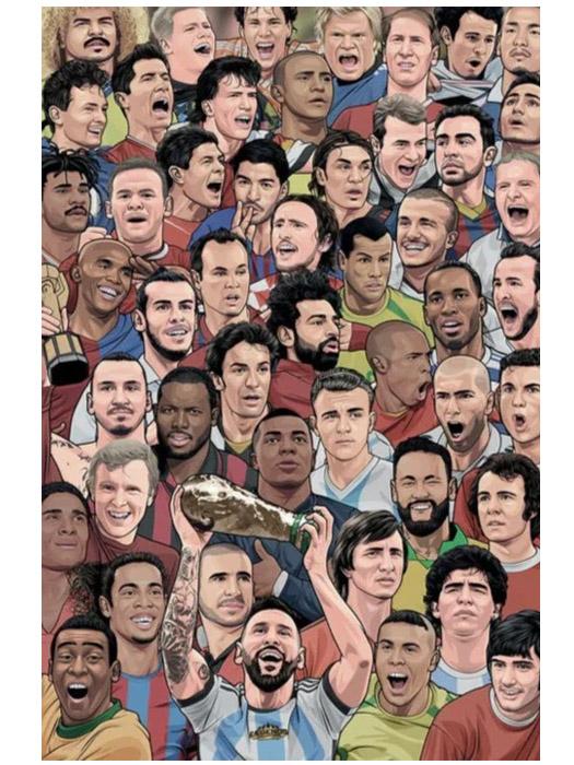 この壮大なポスターには、ロナウド、メッシ、ペレ、ジョージ・ベストなどの名選手たちが、