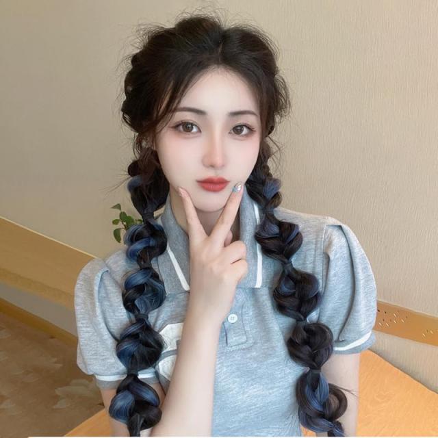 黒色と青色の組み合わせ,2枚入り 【LANJING】ウィッグのおさげ エクステ カールヘア ロング ファッション カール可能 多彩なカラー グラデーションカラー 耐熱シルク素材 長さ約35cm(デザイン:黒色と青色の組み合わせ,2枚入り)