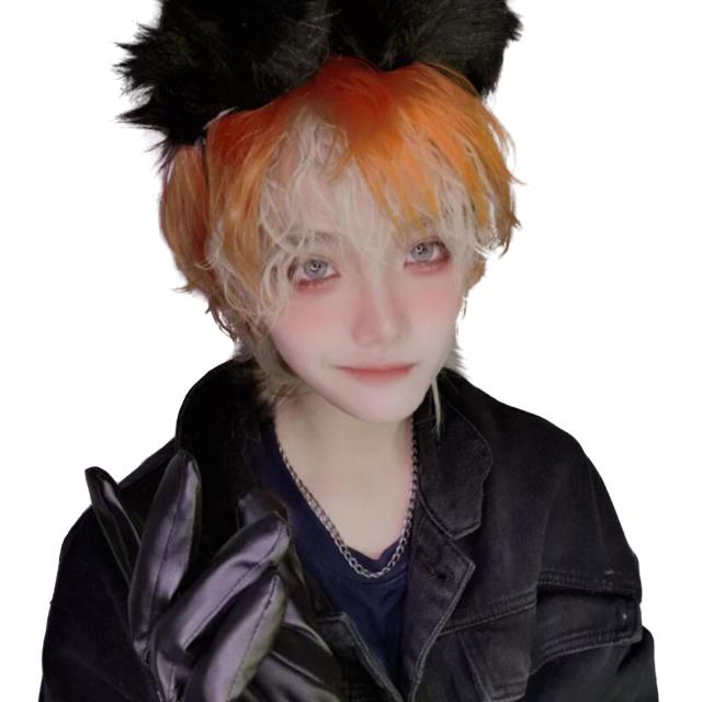 オレンジ・プラチナ(カール) FESHFEN ウィッグ メンズ パーマ ショート ウルフ インナーカラー かつら カール フルウィッグ ふんわり イケメン ハンサム ウルフウィッグ 自然 小顔 耐熱 人気 ファッション 男装 男性 男女兼用 短髪 原宿 ネット/櫛付き インナーカラー オレ