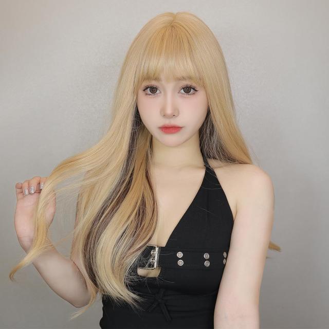 ライトゴールド・インナーカラーライトブラウン Haircube ウィッグ セミロング 巻き髪 ぱっつん前髪 インナーカラー レディース フルウィッグ パーマ 小顔効果 ファッション ミディアム 可愛い 仮装 耐熱 ネット付き (ライトゴールド・インナーカラーライトブラウン)